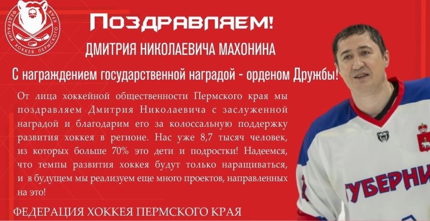 От лица хоккейной общественности Пермского края мы поздравляем Дмитрия Николаевича с заслуженной наградой и благодарим его за колоссальную поддержку развития хоккея в регионе. Нас уже 8,7 тысяч человек, из которых больше 70% это дети и подростки! Надеемся, что темпы развития хоккея будут только наращиваться, и мы в будущем реализуем ни один проект, направленный на это!